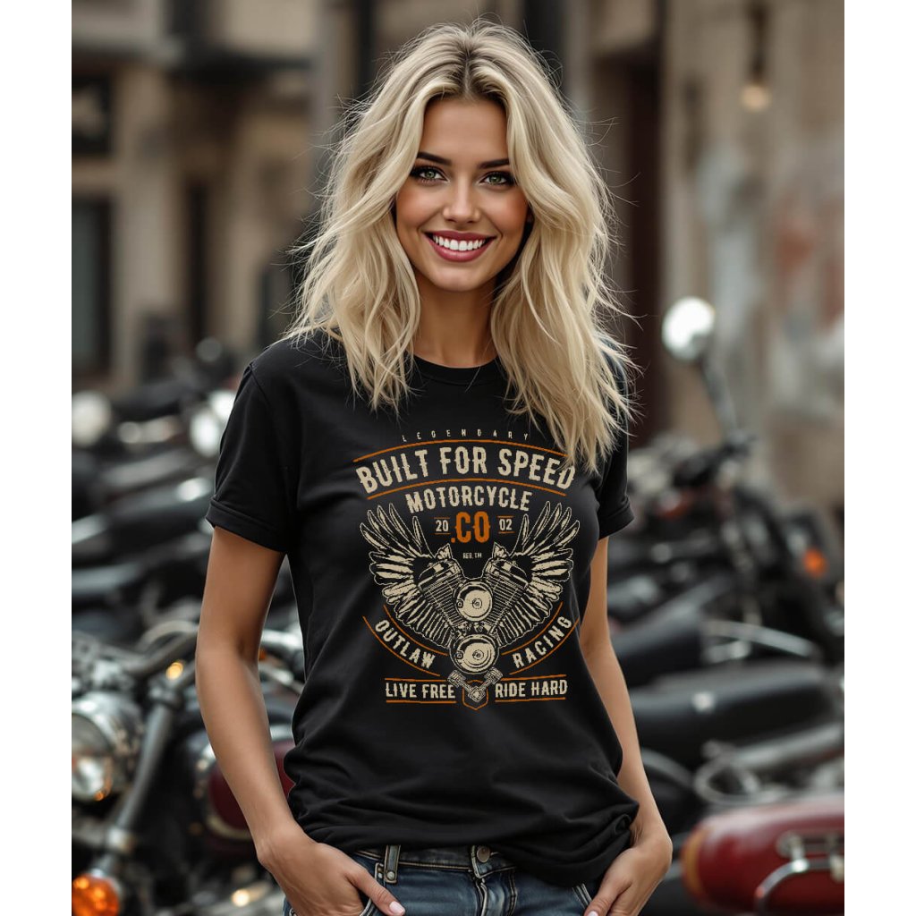 Dámské motorkářské tričko Hanziwork Built For Speed Motorcycle je poctou rychlosti a svobodě. Originální vintage design s okřídleným dvouválcem podtrhne tvůj rebelský styl.