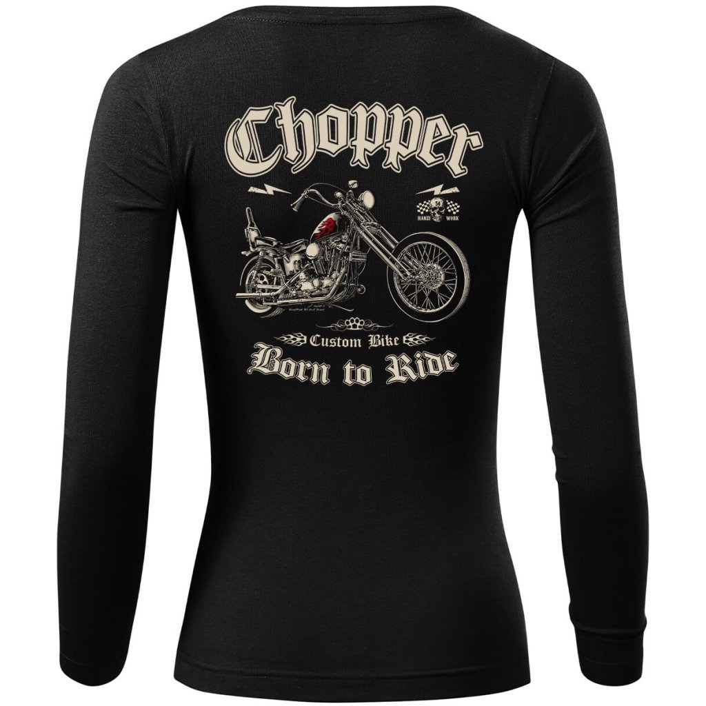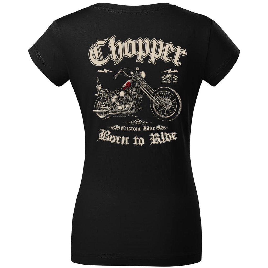 Dámské tričko Chopper Born To Ride je statement pro všechny motorkářky, co se nebojej zatahat za plyn a jet si svůj styl. Dominantní vintage potisk s Chopperem připomíná vůni benzínu, prach silnic a starou školu rock’n’rollu. Je to design, kterej dává jasně najevo, že svoboda není jen slovo – je to životní postoj.