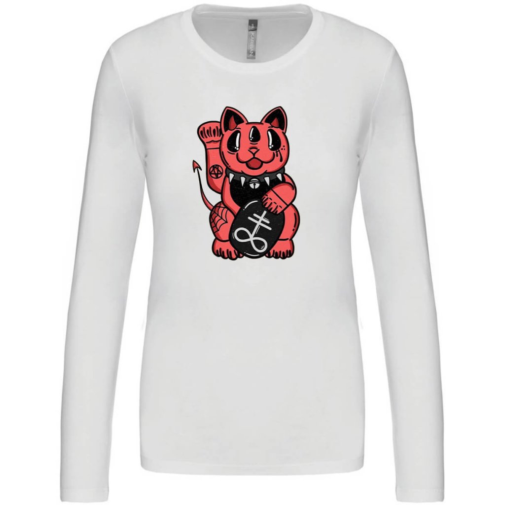 Dámské tričko s motivem Maneki Neko - kočka pro štěstí, která zvedá tlapku, symbolizuje prosperitu a pozitivní energii. Tento tradiční japonský motiv v moderním provedení dodá tvému outfitu nejen styl, ale i kousek dobré karmy!