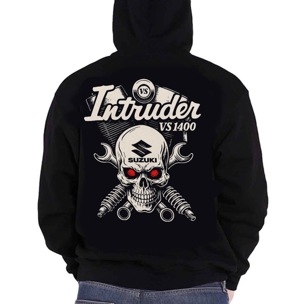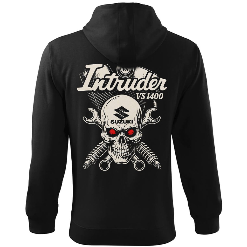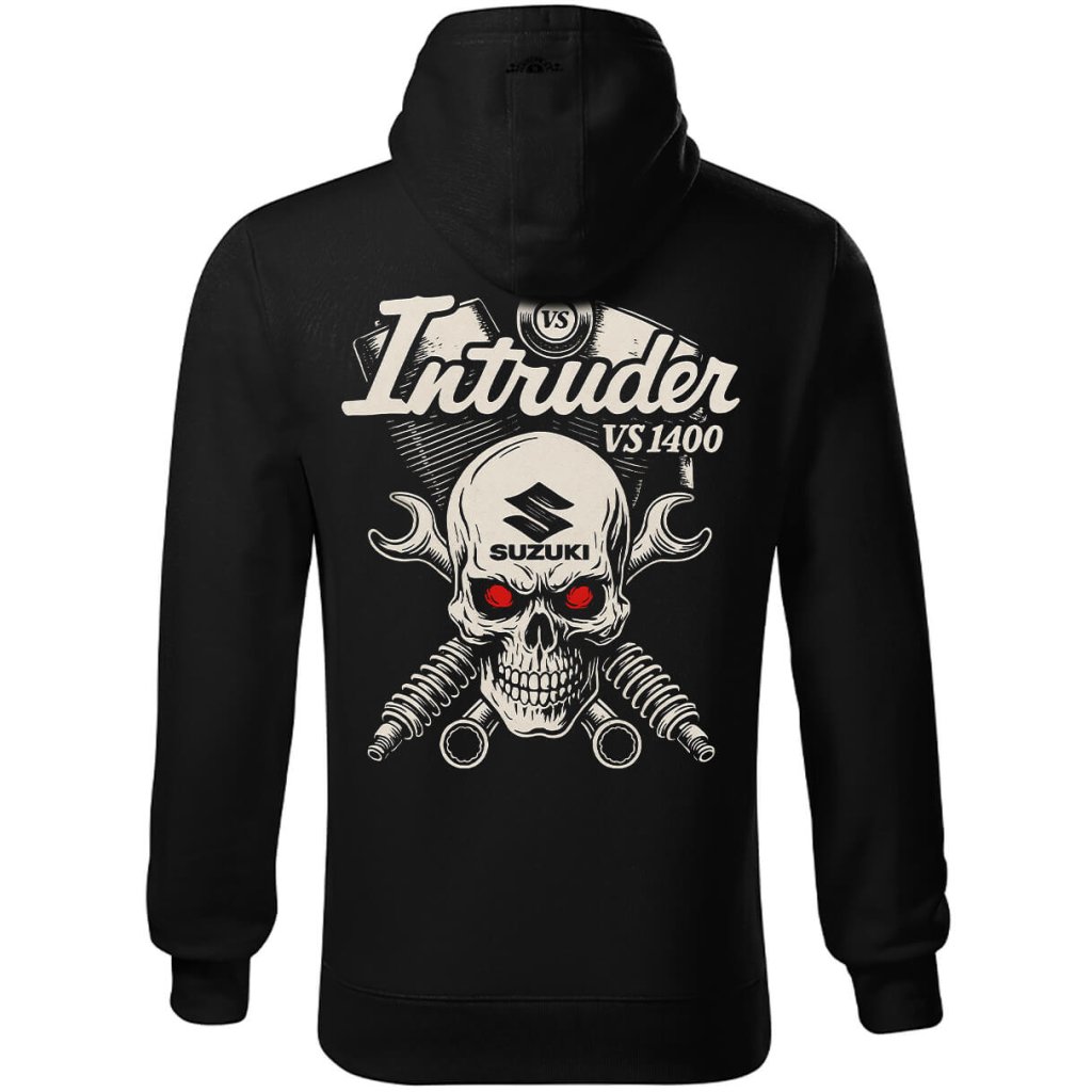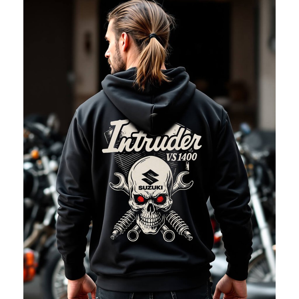 Pánská motorkářská mikina Hanziwork Suzuki Intruder VS1400 Skull je poctou legendárnímu dvouválci, který psal historii silnic. Dominantní potisk motoru s lebkou jasně říká, že tohle není jen motorka – to je životní styl. Design kombinuje sílu, čistotu kovu a rebelský nádech klasické Kustom Kulture.