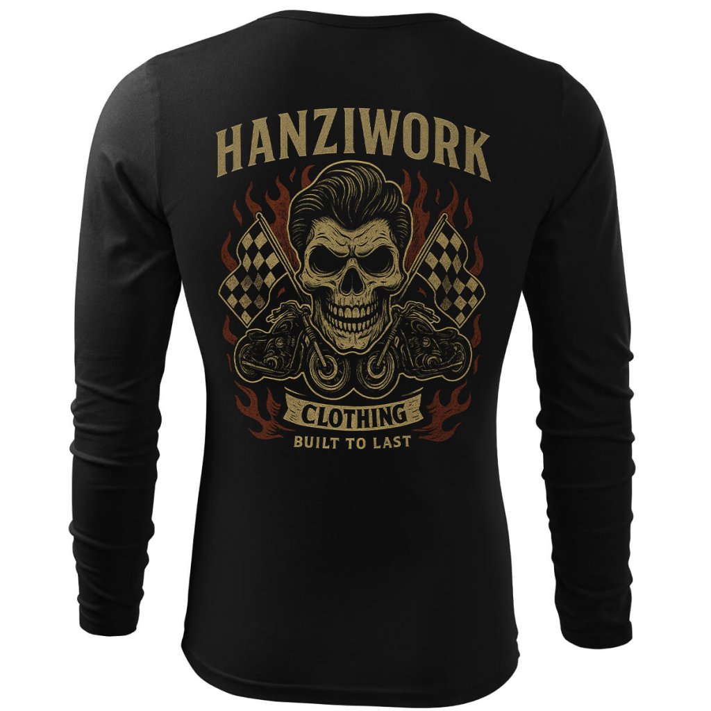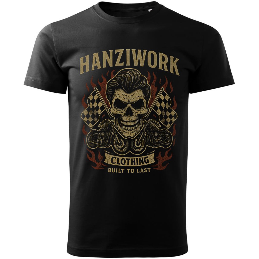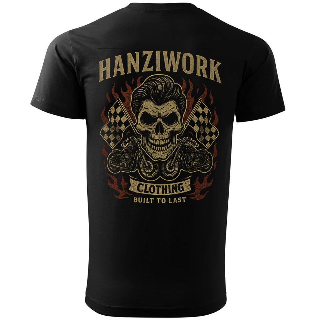 Tenhle motiv je poctou starý škole – divokýmu stylu, co se narodil v garážích a žije dodnes. Hlavní dominantou je vlasatá lebka s legendárním účesem pompadour, která má v očích nespoutanost a v čelisti odvahu. Pod ní burácí dva motocykly, symbol svobody a nespoutané jízdy. Celý motiv lemují šachovnicové vlajky, které připomínají závodní cílovku – tady se jede na doraz. Nad motivem hrdě svítí velký nápis HANZIWORK, pod ním stuha s výrazem CLOTHING a celé to uzavírá heslo, který mluví za všechno: BUILT TO LAST, přesně vystihuje odolnost, kvalitu a hodnoty této značky..