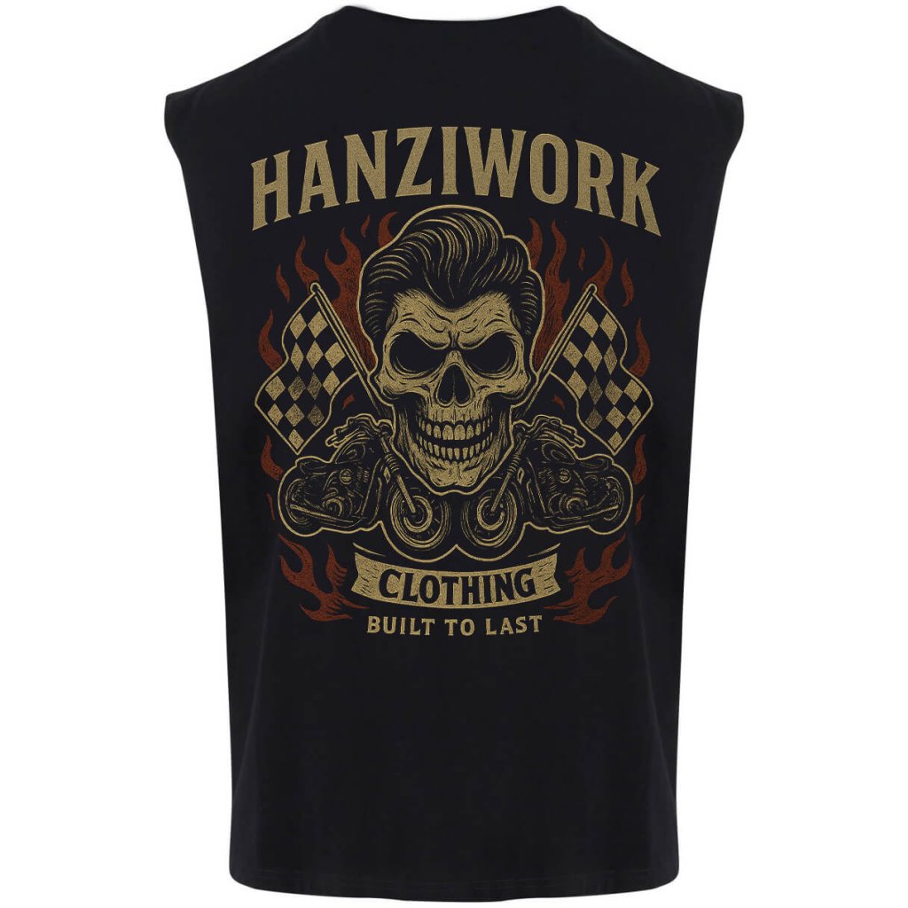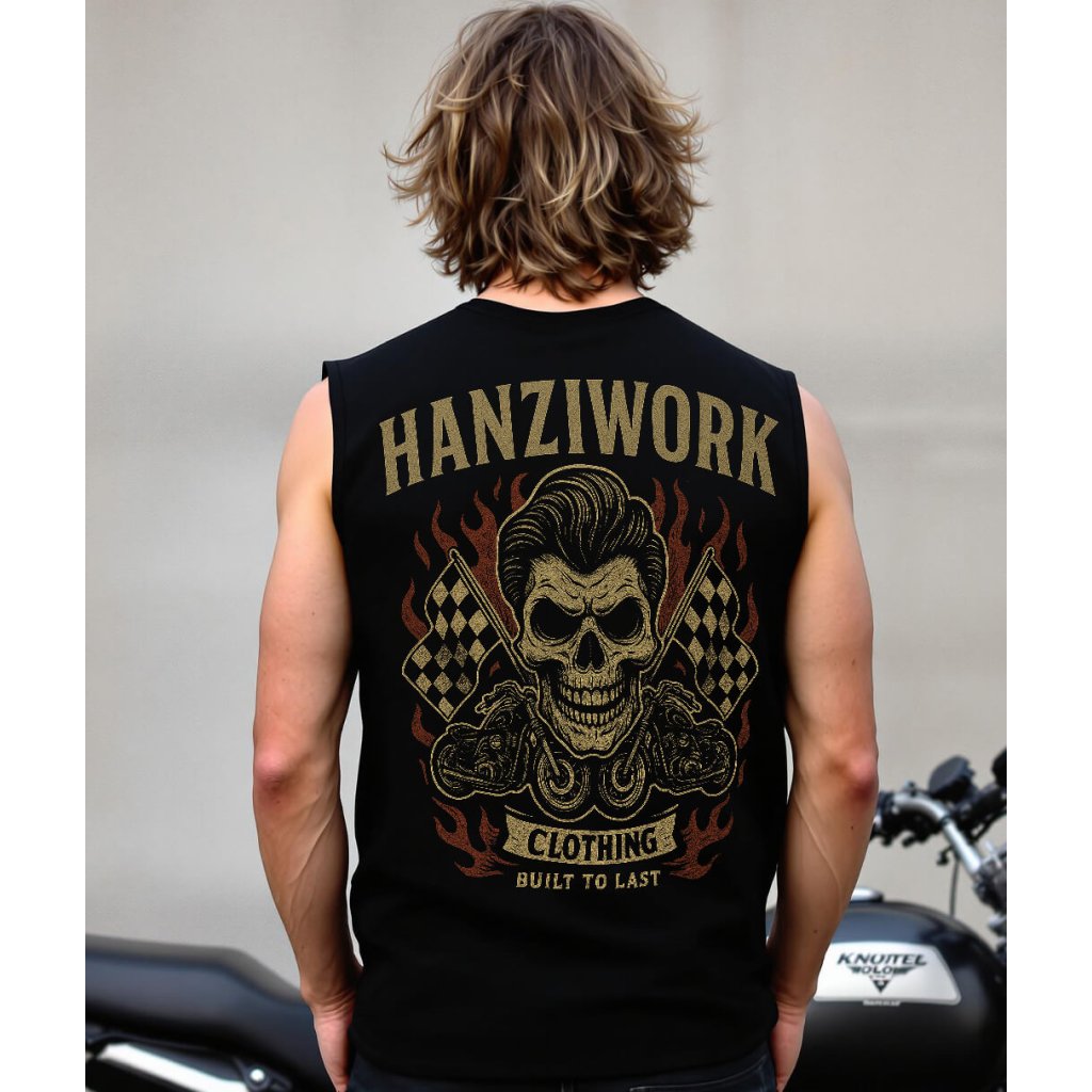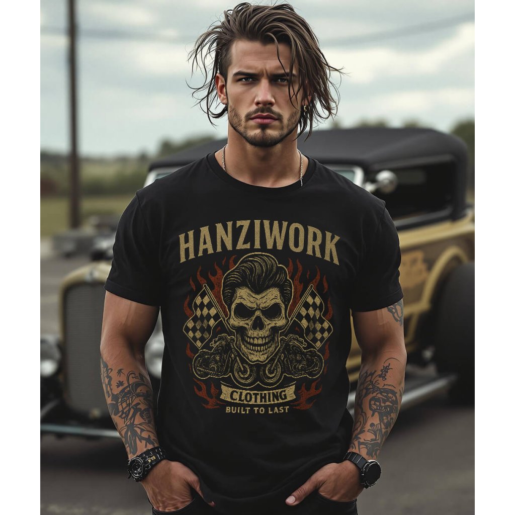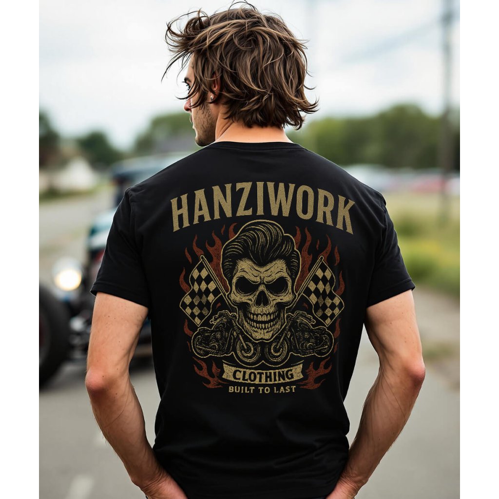 Tenhle motiv je poctou starý škole – divokýmu stylu, co se narodil v garážích a žije dodnes. Hlavní dominantou je vlasatá lebka s legendárním účesem pompadour, která má v očích nespoutanost a v čelisti odvahu. Pod ní burácí dva motocykly, symbol svobody a nespoutané jízdy. Celý motiv lemují šachovnicové vlajky, které připomínají závodní cílovku – tady se jede na doraz. Nad motivem hrdě svítí velký nápis HANZIWORK, pod ním stuha s výrazem CLOTHING a celé to uzavírá heslo, který mluví za všechno: BUILT TO LAST, přesně vystihuje odolnost, kvalitu a hodnoty této značky..