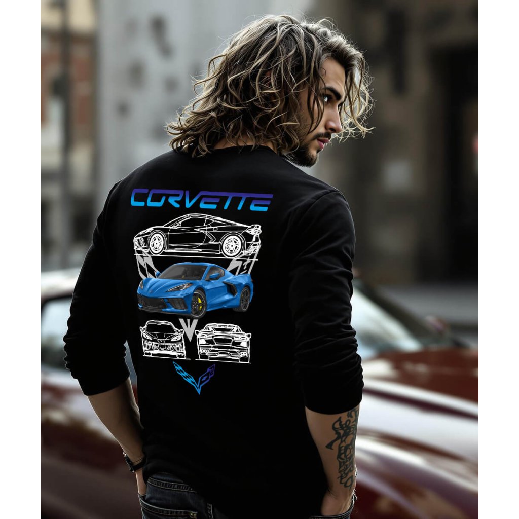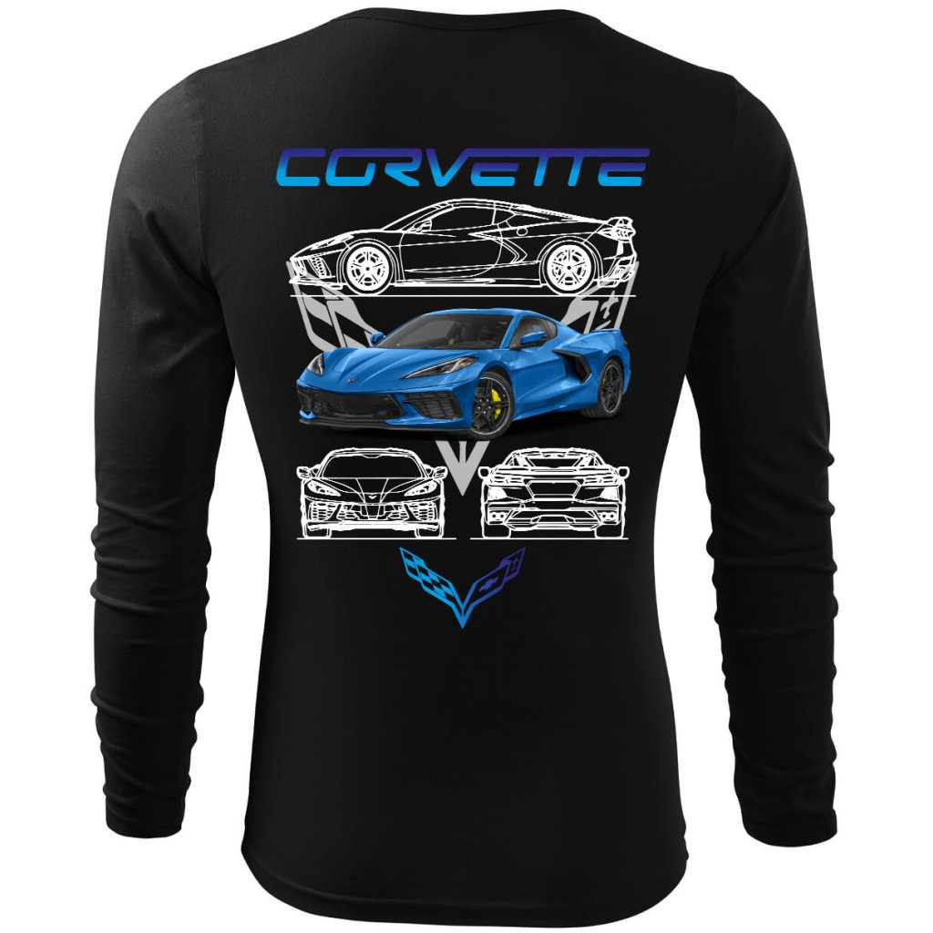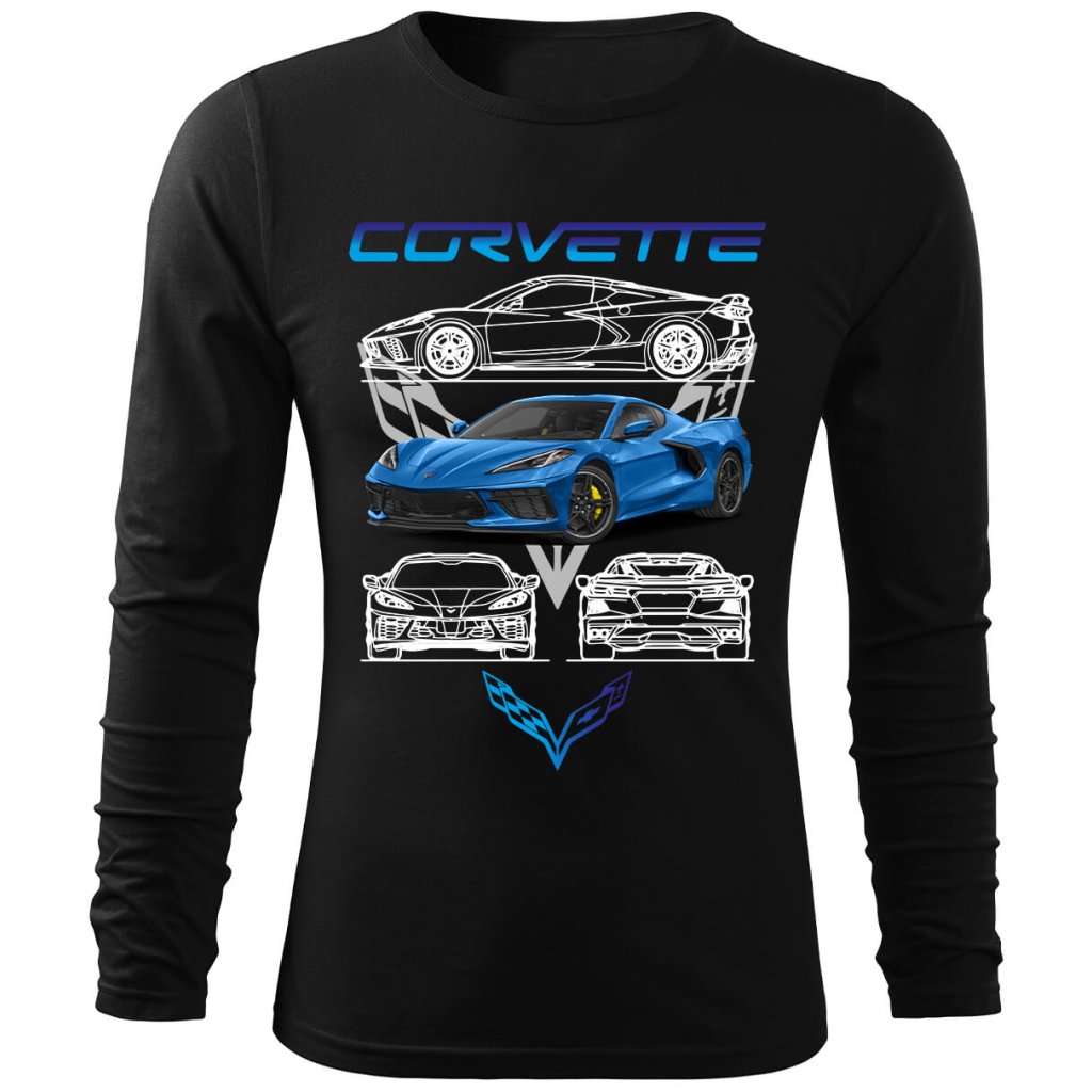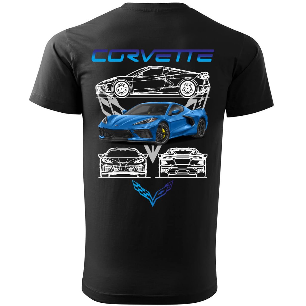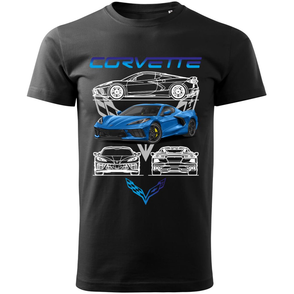 Stylové pánské tričko s detailní grafikou legendárního modrého Chevroletu Corvette, který je symbolem americké automobilové vášně. Dominantní motiv doplňují technické nákresy vozu umístěné nad i pod autem, které dávají designu autentický inženýrský šmrnc. Celý motiv korunuje výrazný nápis „CORVETTE“, který mluví sám za sebe.