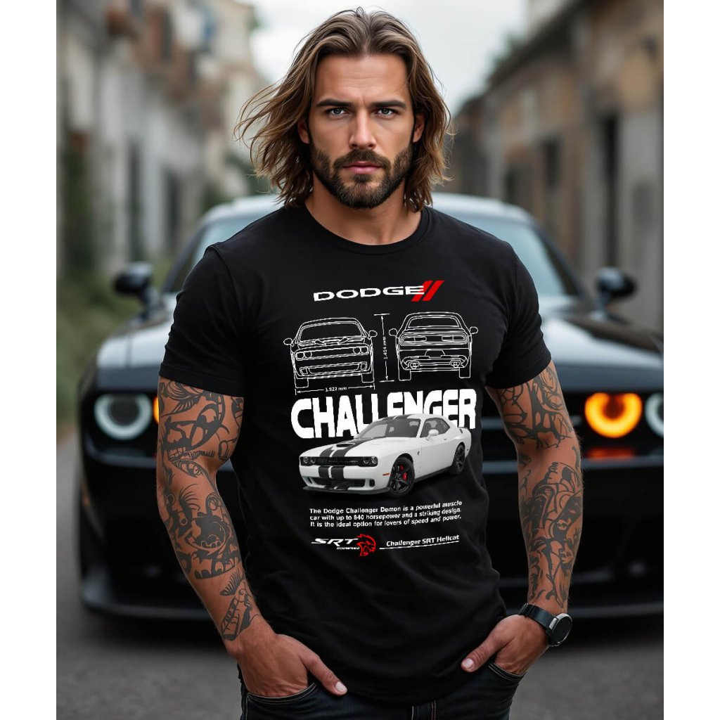 Pánské tričko s motivem legendárního Dodge Challenger SRT Hellcat je must-have pro všechny fanoušky amerických muscle cars. Dominantou potisku je bílý Hellcat s dvojicí závodních pruhů přes kapotu a střechu – v ikonickém agresivním postoji, připravený vystartovat.