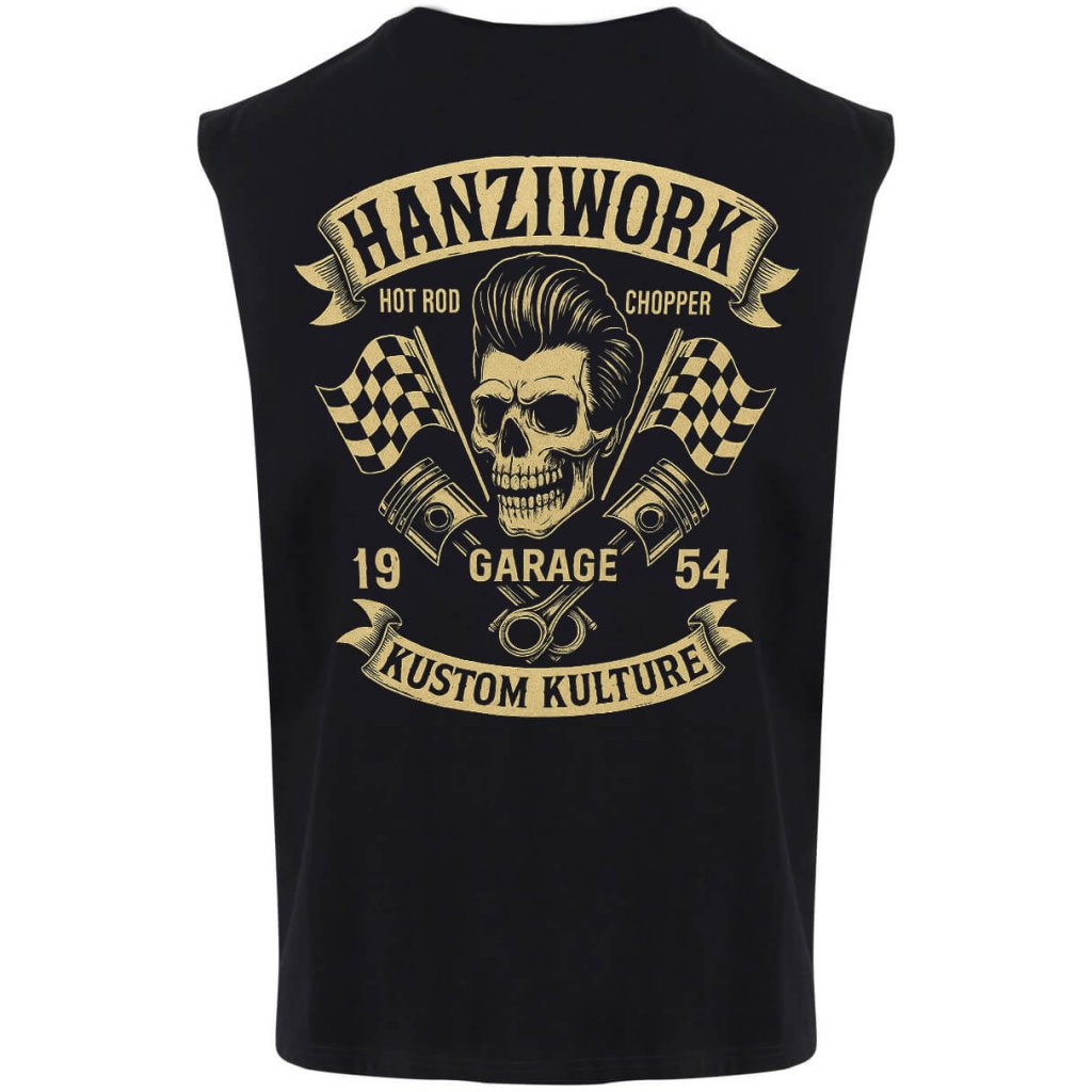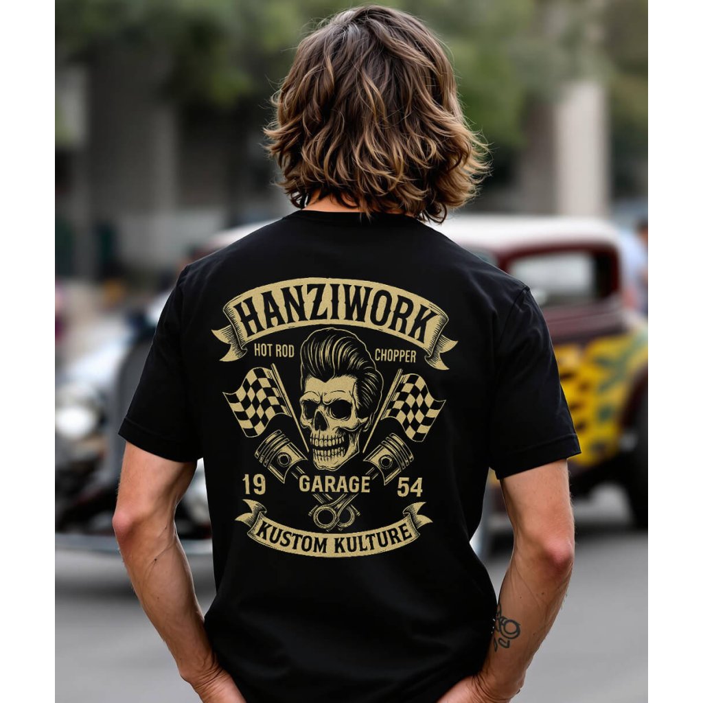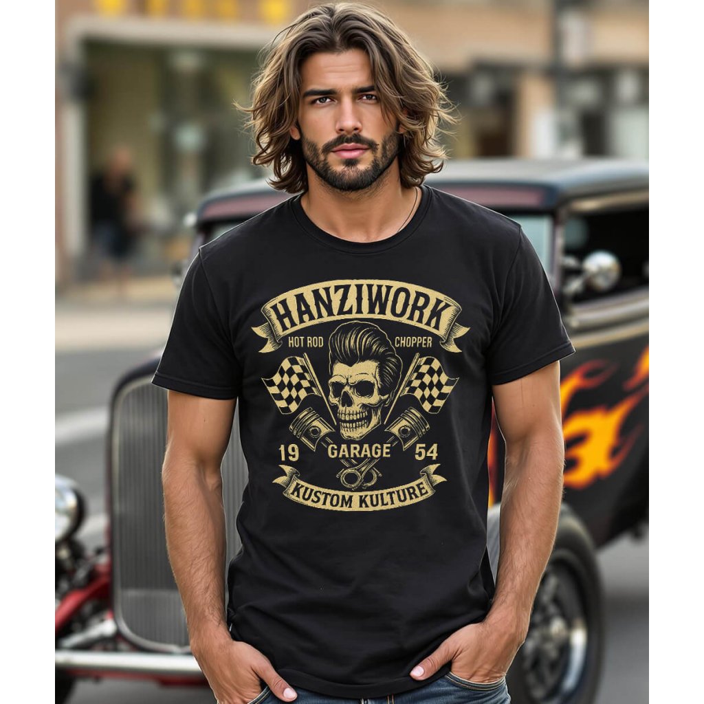 Pánské tričko s potiskem Hanziwork Kustom Kulture je výrazný kousek pro každého fanouška Hot Rodů a rebelství. Lebka s účesem, zkřížené písty a závodní vlajky dodávají designu autentický garážový styl. Vyrobeno s láskou a hrdostí v České republice.