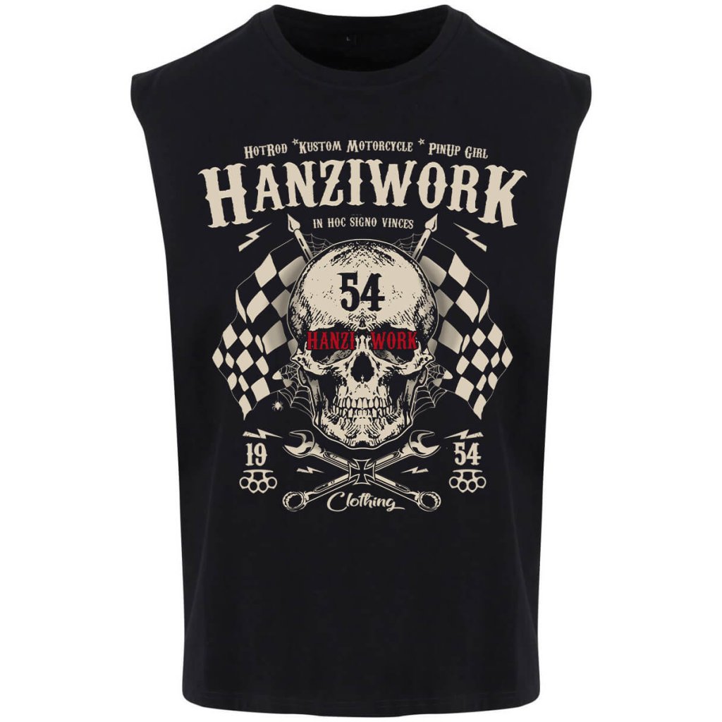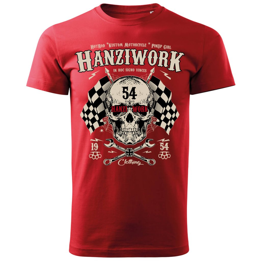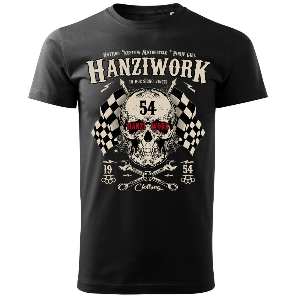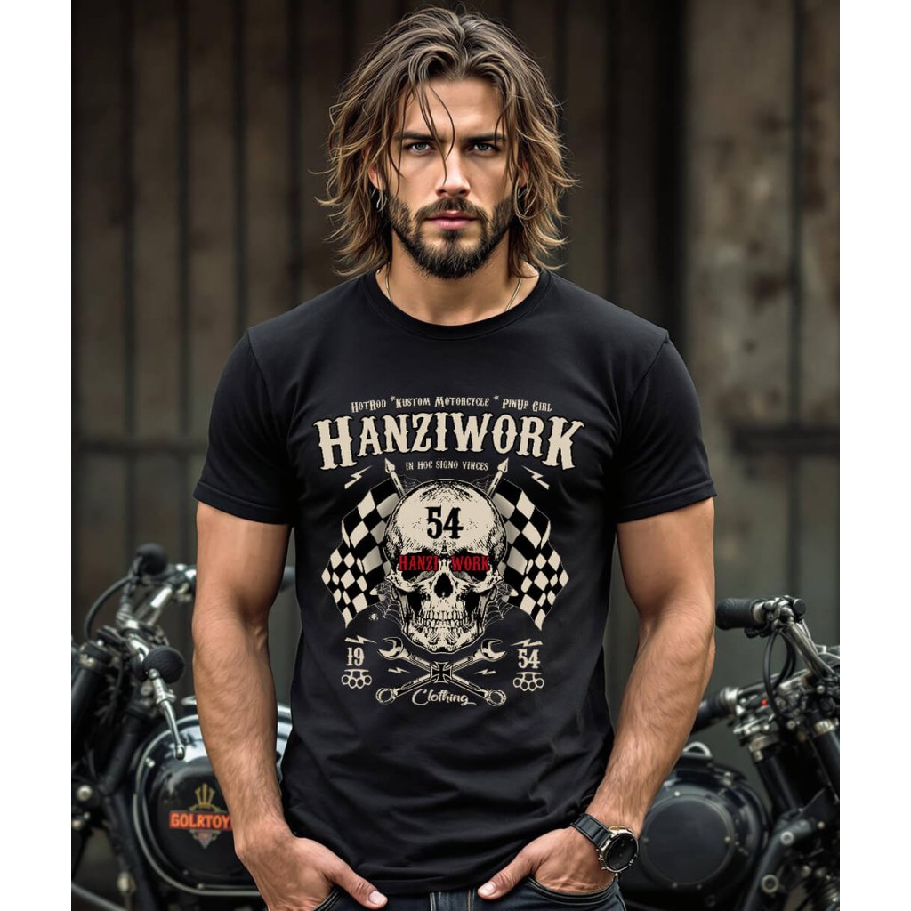 Pánské tričko Hanziwork Skull není jen obyčejný kus oblečení, ale výraz postoje a životního stylu. Potisk kombinuje lebku, křížené klíče a šachovnicové vlajky, které společně vytvářejí silný symbol rebélie, odhodlání a vášně pro stroje i silnice. Vintage typografie a detaily inspirované motorkářskou kulturou dodávají tričku autentický Oldschool charakter. Vyrobené z kvalitní 100% bavlny nabízí maximální pohodlí, odolnost a příjemný pocit při nošení. Díky pečlivému zpracování a pohodlnému střihu se hodí jak do dílny, tak i na motorkářský sraz nebo noční jízdu po asfaltu.