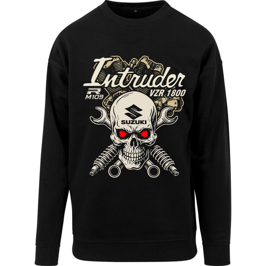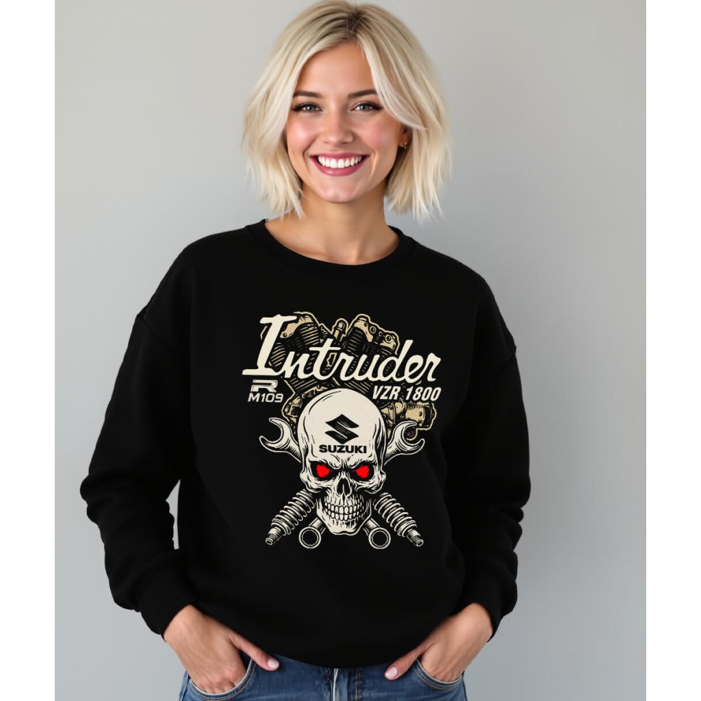 Dámská mikina Suzuki Intruder VZR 1800 / M109R je pro ženský, co jedou cruiser styl bez kompromisu. Výrazný záda s lebkou, motorem a klíčema dávají jasnej signál – garáž, železo, Intruder.