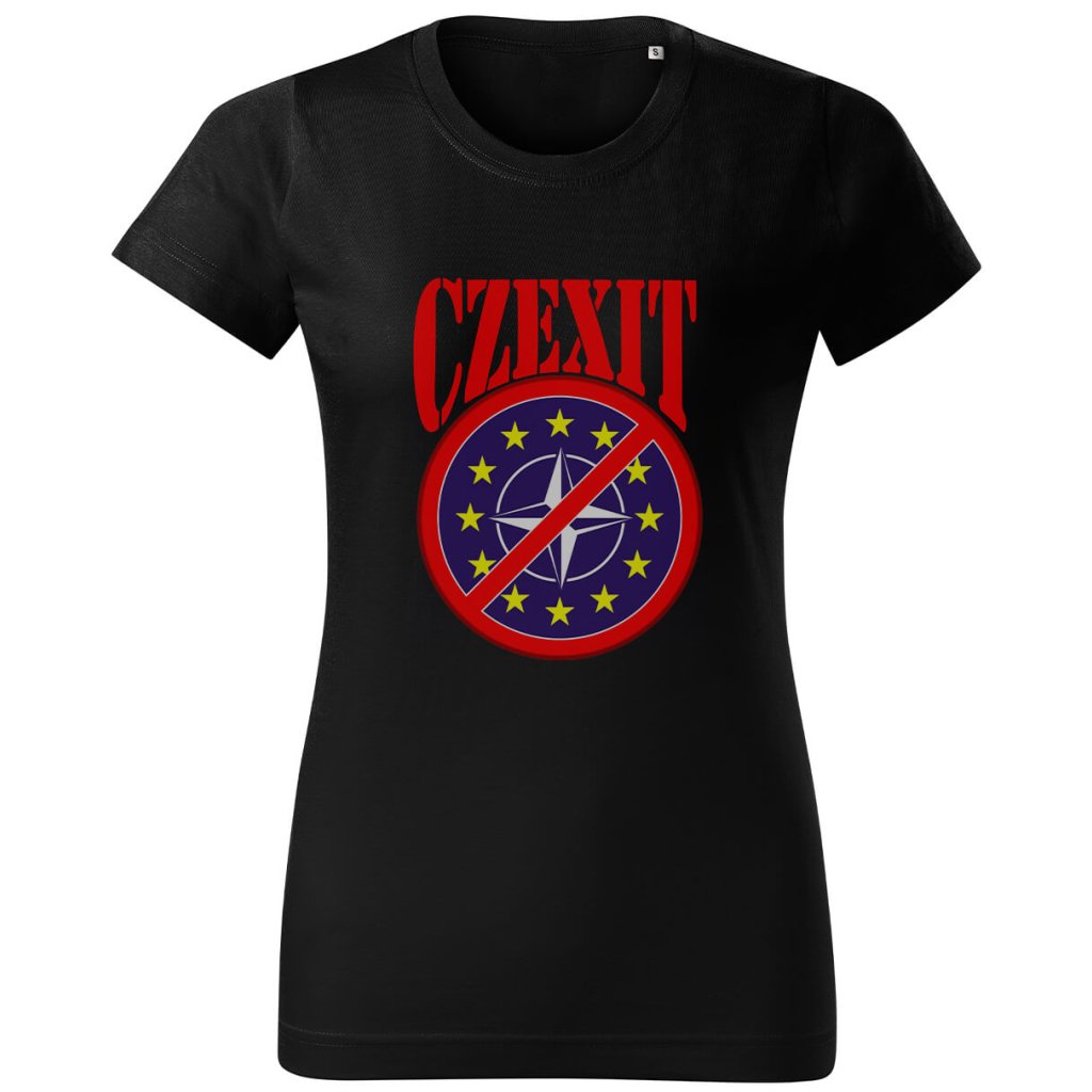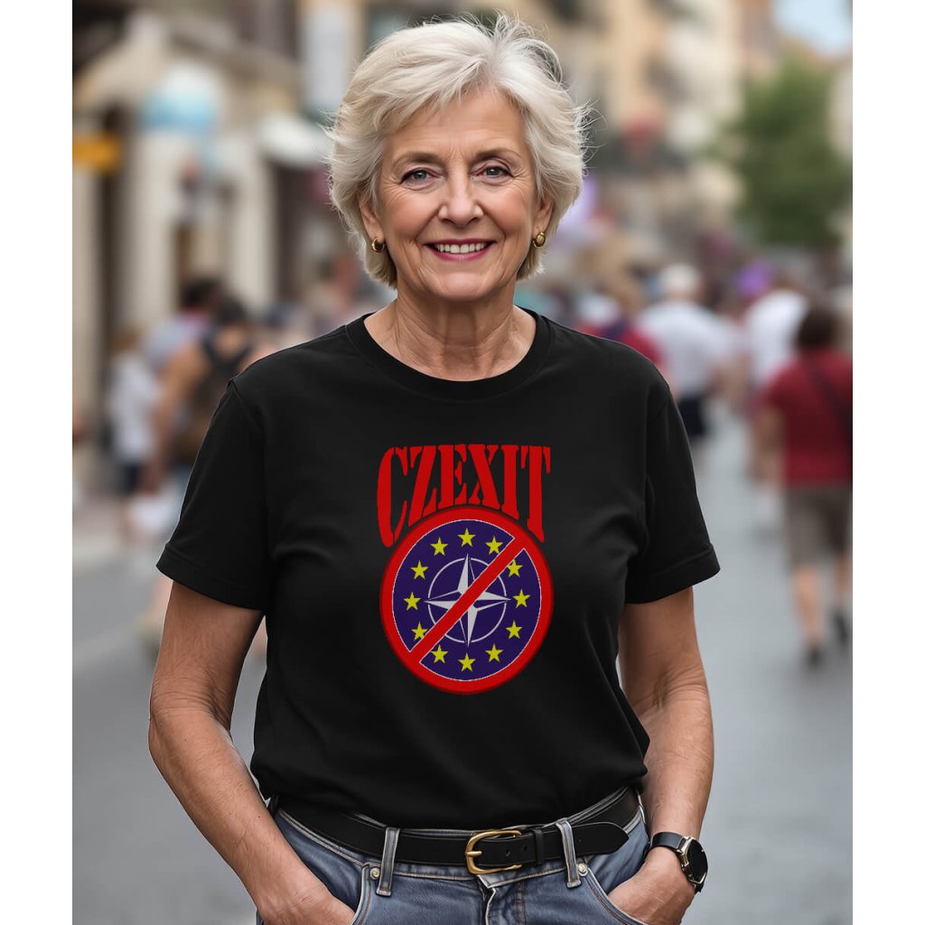Dámské triko Velký CZexit — čistý hanziwork vibe: nápis CZEXIT. Design symbolizuje českou státnost a odkaz na odchod z EU a NATO vizuálně, bez keců. Pohodlné dámské tričko, ženský střih, triko co sedne a mluví samo za sebe.