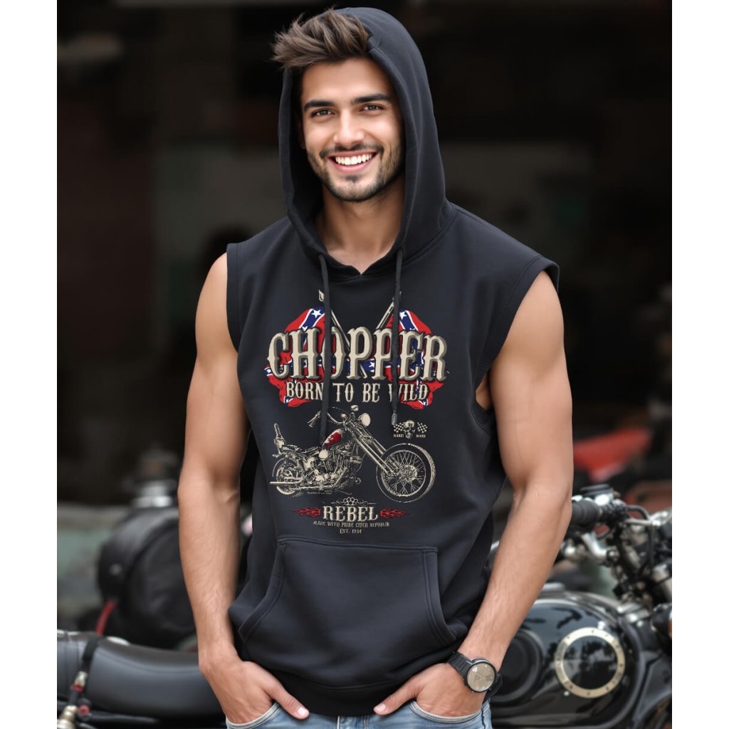 Tahle mikina bez rukávů s kapucí je kus pro chlapy, co mají blízko k chopperům, garáži a starýmu dobrýmu rebel stylu. Bez rukávů ti nechá ruce volný, kapuce drží správnej vibe a potisk Chopper Born To Be Wild řekne všechno hned. Funguje na sraz, do dílny i do města — prostě všude tam, kde nechceš vypadat jak z katalogu, ale jako člověk, co ví, co nosí.