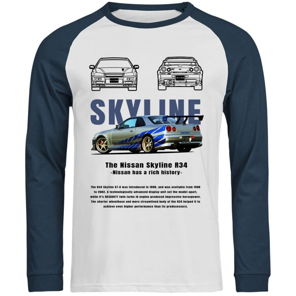 Pánské raglan tričko Nissan Skyline R34 je pro ty, co vědí, co znamená JDM legenda. R34 není o vzhledu – je o technice, výkonu a respektu, který si vybudoval na silnici i na okruhu.